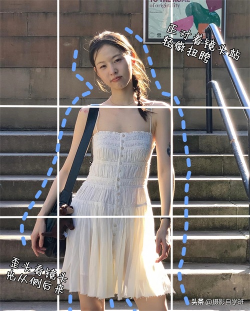 当你站在台阶上时,可以尝试一脚在上、一脚在下的姿势。侧身回头看向镜头,这样的动作不仅显得优雅,还能拉长腿部线条,让身材更加修长。摄影师可以从稍低的角度拍摄,以突出你的身材优势。
