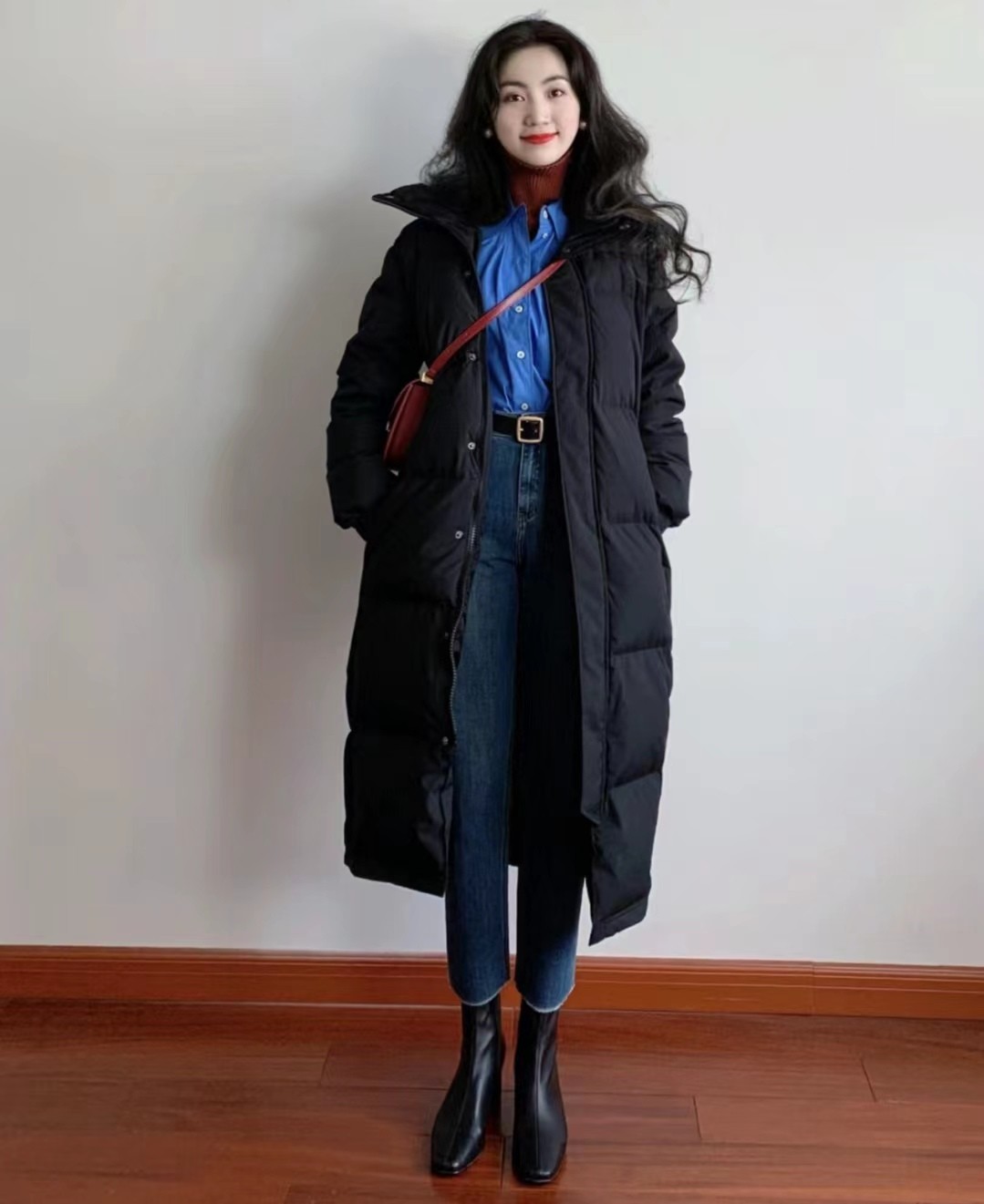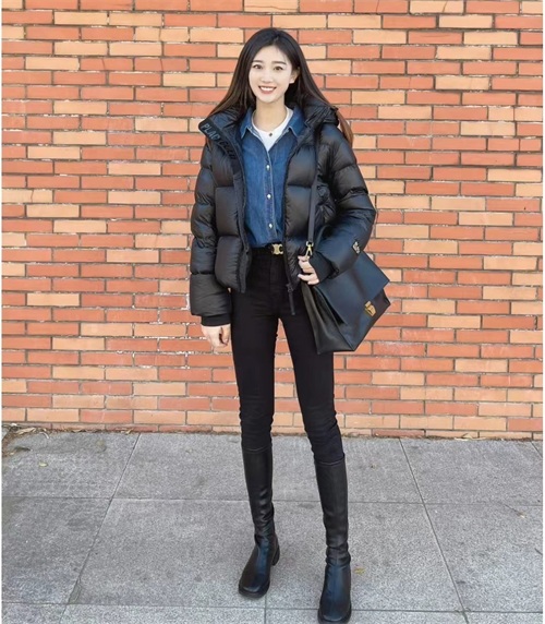 第一种搭配方法:黑色羽绒服+蓝色牛仔裤