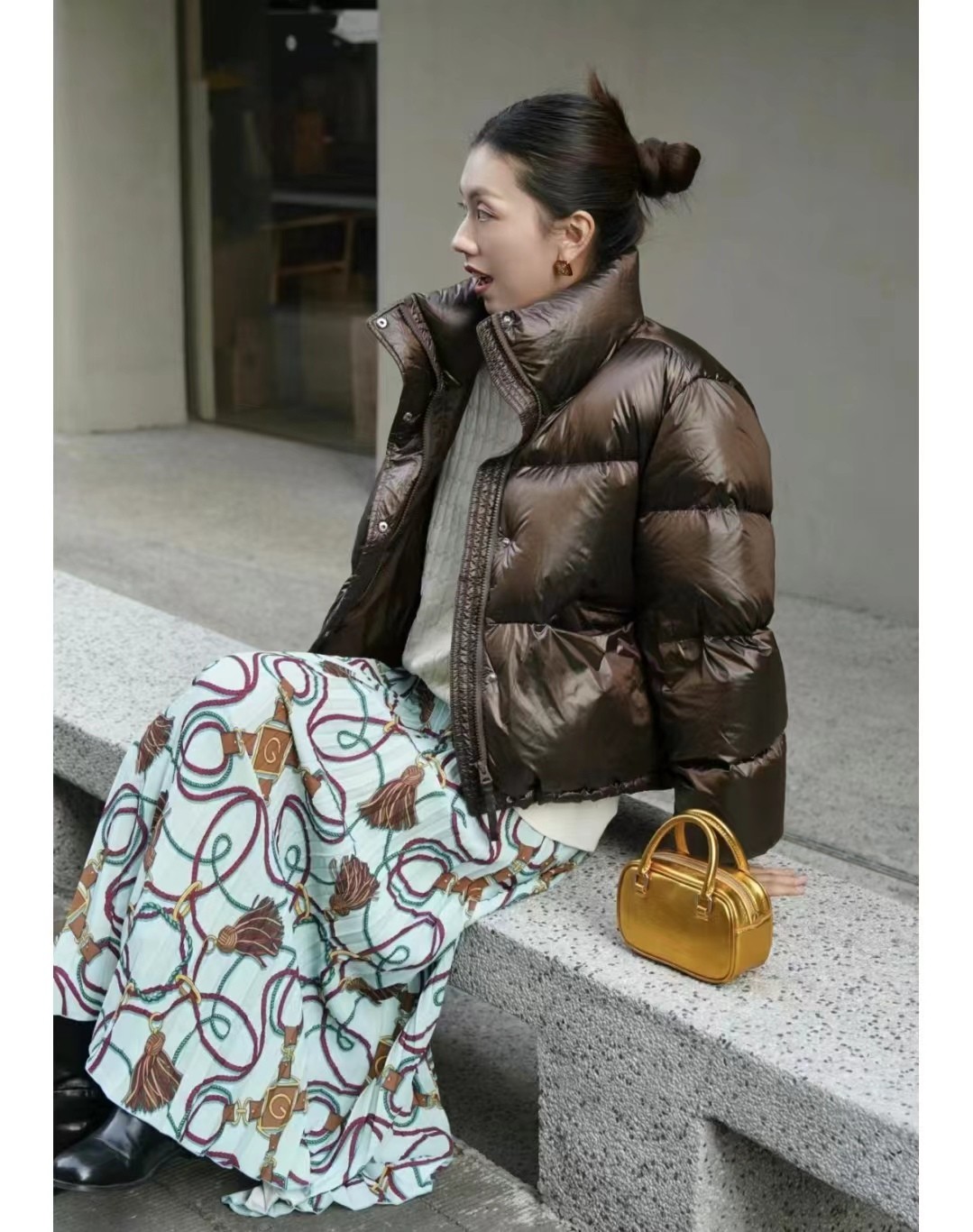 印花裙是女性的浪漫代表,与黑色羽绒服搭配碰撞出时髦的火花。选择色彩艳丽的印花裙,再配上一双黑色/棕色短靴,浪漫又不失时尚感,展现出复古优雅的女性魅力。
