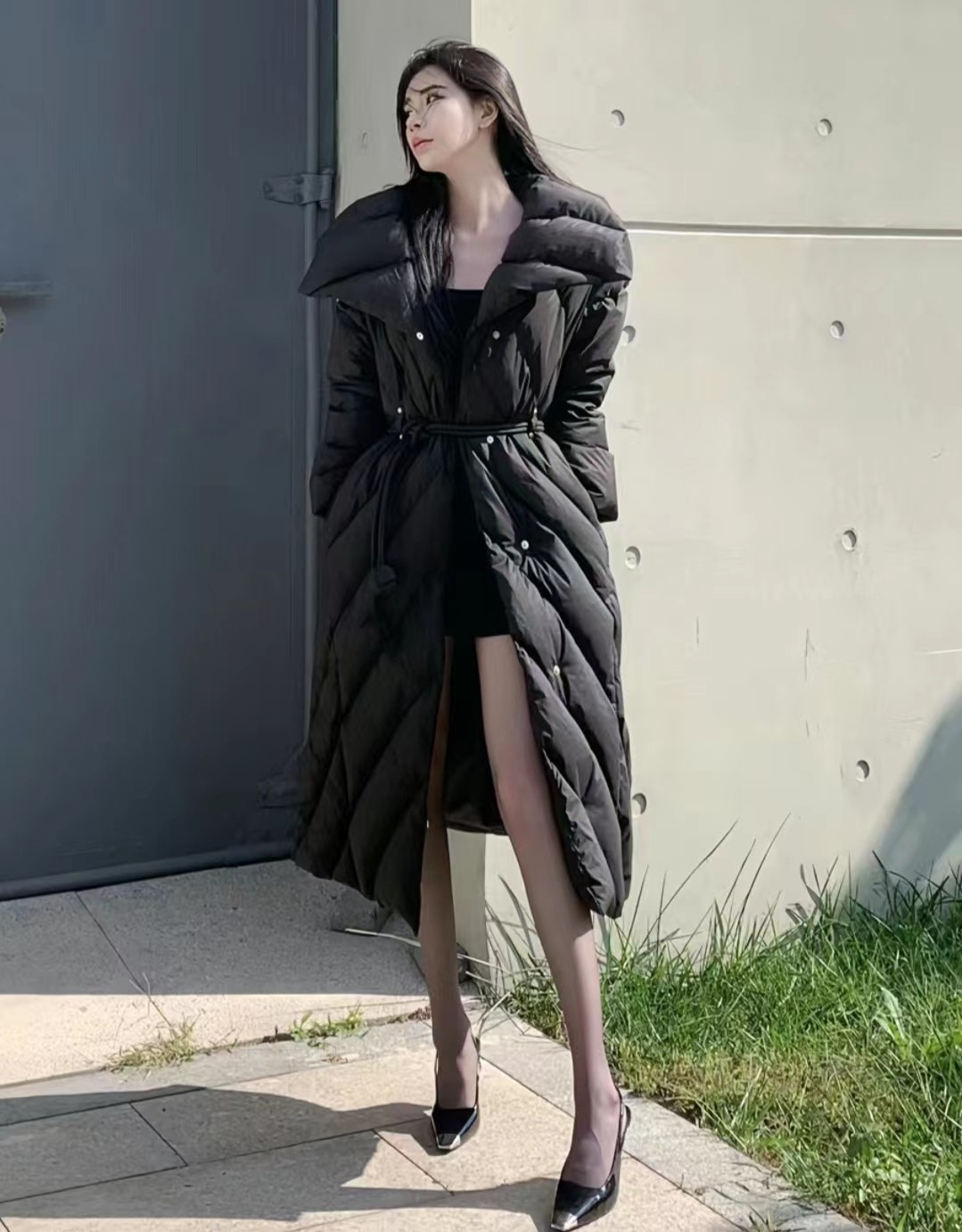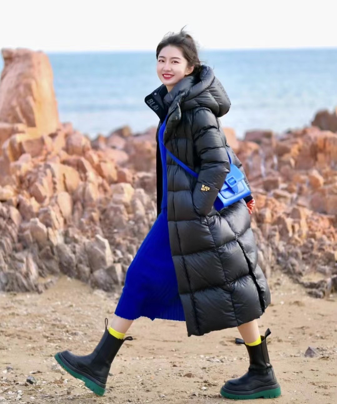 长裙是女性的优雅代表服饰,与黑色羽绒服的搭配也能碰撞出不一样的火花。选择一条质地柔软的飘逸长裙,再搭配一双短靴或高跟鞋,优雅又不失时尚感,展现出温柔浪漫的女性魅力。