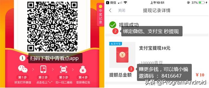 提现步骤:1.扫码下载 中青看点 app(新闻类app)。2.使用微信登陆,然后提现1元。3.填写小编邀请码 84166474.小编提现10元 截图如下: