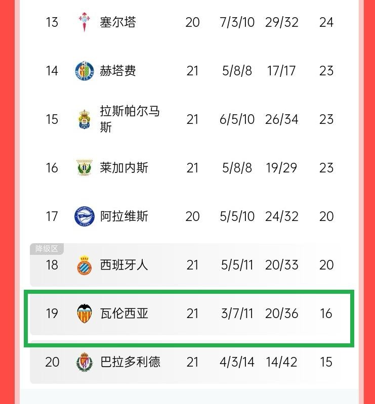 降级区则是瓦伦西亚、西班牙人和巴拉多利德,尤其是曾经的西甲冠军、西甲传统强队瓦伦西亚本赛季一直深陷降级区,令人意外。