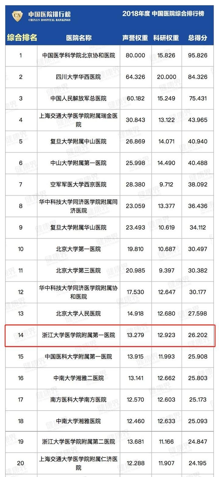 2018年度中国医院排行榜浙大一院综合排名全国第14