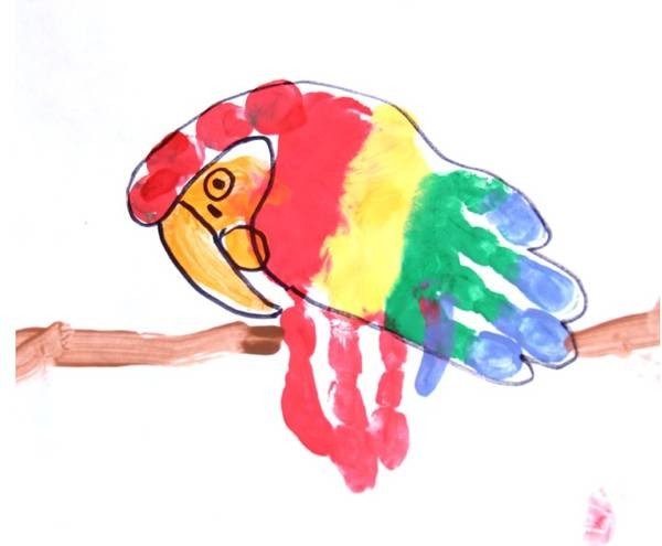 3、再用三个手指,涂上颜料,印成鹦鹉的翅膀