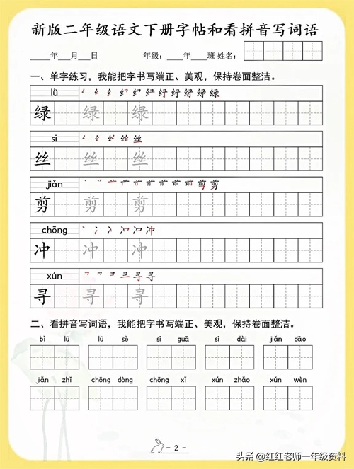 新版二年级语文下册字帖和看拼音写词语