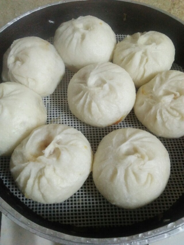 将发酵好的面取出,放案板上,以一斤老面二点五克小苏打〈小苏打用水化开〉,充分柔匀,稍醒二分钟左右,开始搓条下剂!手拍薄面皮,制作自己囗味的包子,做好以后不用醒发,开水上锅五分钟即可