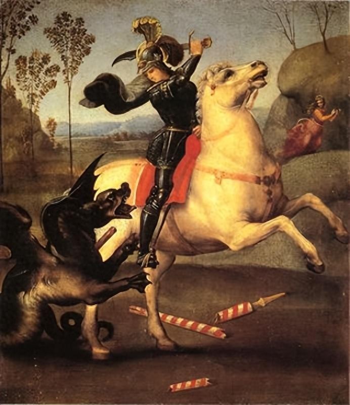 这幅画取材于《圣经》故事:由于文化差异,龙在我国是神圣祥瑞的标志,在西方确实邪恶怪物的象征,西方英雄都以杀龙除恶为大义,一个美丽的少女被献给恶龙当祭品,做为英格兰的保护神的圣乔治纵马挥舞利剑,斩杀恶龙的故事。