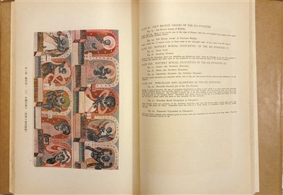 好大的开本。书名一望即知是郭沫若所题。上下两册,横纹土黄牛皮纸护封,深蓝色细布面精装,封面书名烫金。正文用重磅道林纸,图版用珂罗版精印,中英文字页面手摸上去微微有凹凸感。另有手工贴片彩色图片若干。书前书后,干干净净,既无公藏盖章编号,也无私藏题跋钤印。更不解者,连版权页也没有。书前两篇序文,注明的时间一为1951,一为1952。再看“中国古典艺术出版社”这个名号和纸张颜色、字体风格,我大体能判断出这套书应是1950年代的出版物。