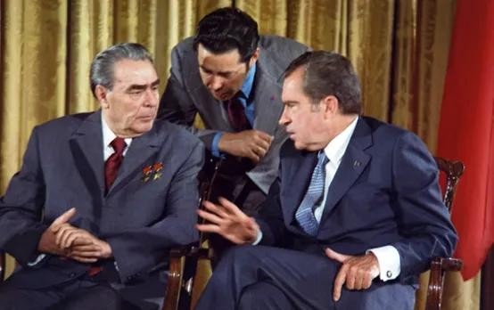勃列日涅夫和尼克松,1973。早年的勃列日涅夫对内政策温和,对外与美接触,苏联国力在六十年末七十年代初蒸蒸日上