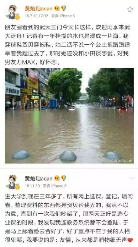 俩人微博互动也很频繁,都是生活中动人的友情小细节,比如贺贝抱着黄灿灿踏水路,比如贺贝帮黄灿灿选课。