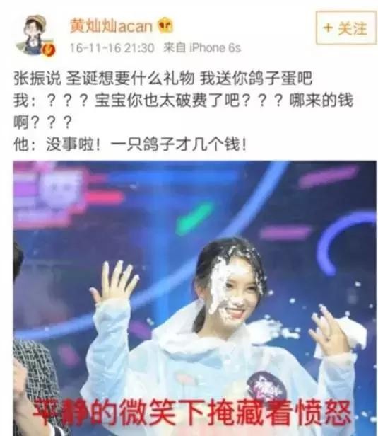 差不多也是在那个时候,黄灿灿在微博晒出了与男友张振的激吻照公布恋情。
