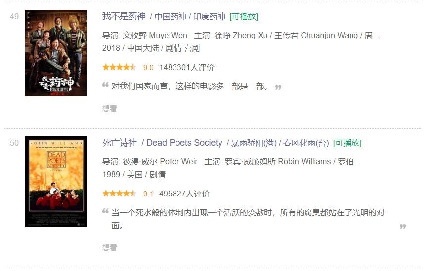 反观豆瓣Top250榜单,《我不是药神》等口碑热门电影都很容易一下子就把一些经典电影挤下去,现在排名比《教父2》还要高,这并没有经过时间的验证,其权威性自然不及IMDb。