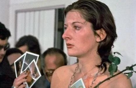(Rhythm 0)— 残忍剧场 1974年,意大利那不勒斯正在进行一场行为艺术表演,在一个开放的空间里,一位女士端坐在椅子上,似乎注射了麻醉剂,四肢无法动弹。在这位女士面前有一张桌子,上面摆放着许多令人不解的物品,有花朵、蜂蜜、剪刀、匕首,和拥有真实威力的手枪,一共有72件用途不同的物品。