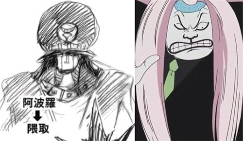 偎取(阿波罗)的变化无疑是最大的,尾田大神直接换了一个全新的角色。还别说,草稿版本的偎取很有大BOSS的气场,这或许是为了给路奇面子,所以最终取消了这个设计,让偎取变成一个非常搞笑且有趣的角色。