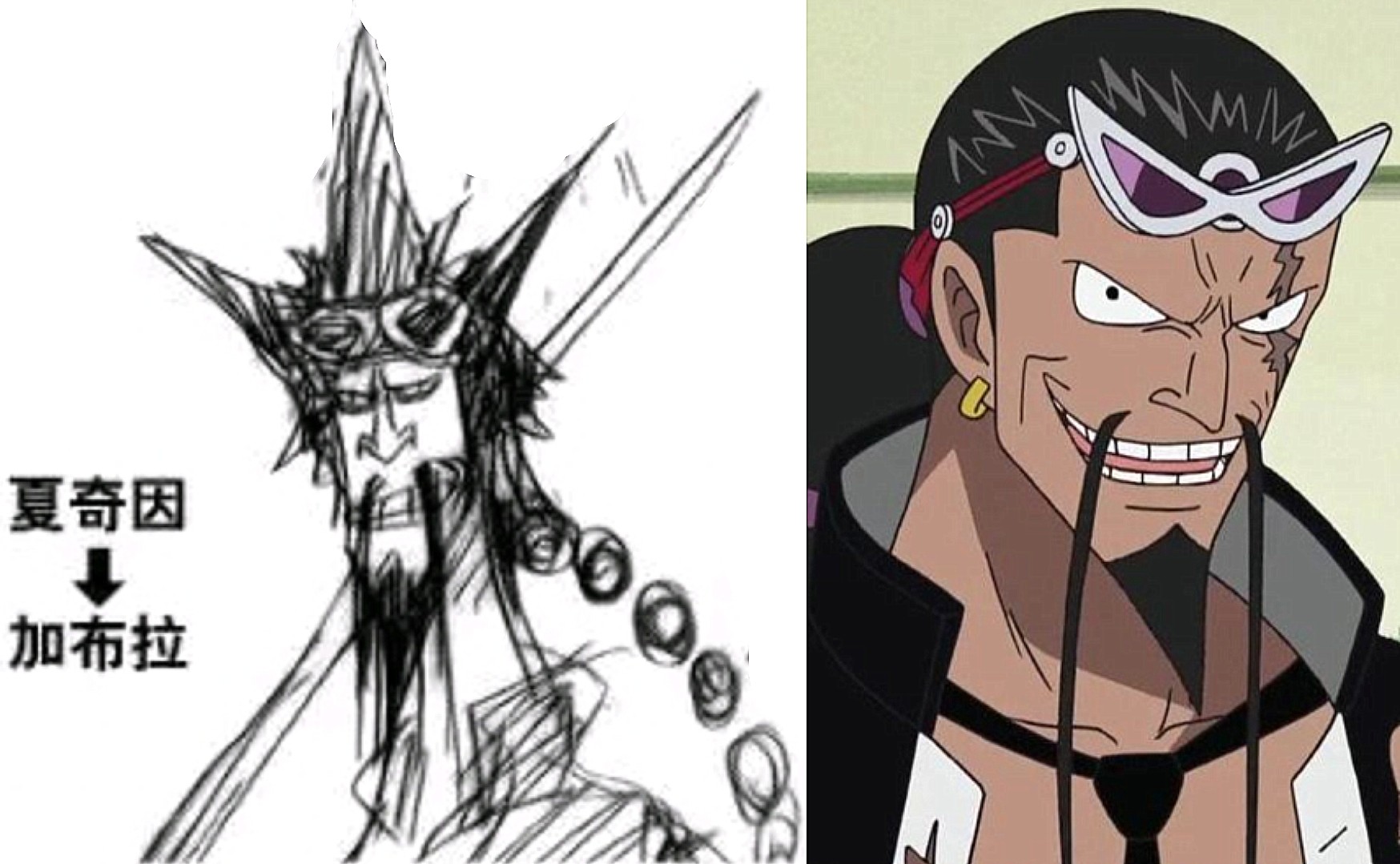 草稿的加布拉是真猥琐,而且还有一个旧名字【夏奇因】,的确没有前者好听。另外他早期的造型如同一位杀马特的糟老头,丝毫没有杀手该有的气场,就这样的角色,或许没人会在意他是CP9成员。