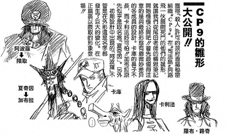 他塑造的CP9一直都是经典BOSS,如今路奇等人已经晋升为CP0,还在蛋头岛登场了,虽然结果还是惨败,但实力也有了质的飞越。那么,你可知道尾田在创作CP9的雏形是怎样的?已经有相关资料公布了,不妨一起来看看。