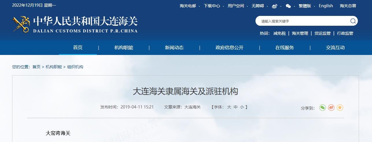 据大连海关官网介绍,大东港海关是受大连海关直接领导的正处级隶属海关。功能类型为口岸型,管辖范围为:丹东港大东港港区、大台子口岸、大鹿岛口岸、丹纸码头和丹东市振兴区安民镇(不含浪头机场、安民临时开放口岸)、东港市、大孤山经济区。主要负责党的基层组织建设和干部队伍建设;办理具体海关业务,反馈执法作业结果;完成大连海关交办的其他工作。