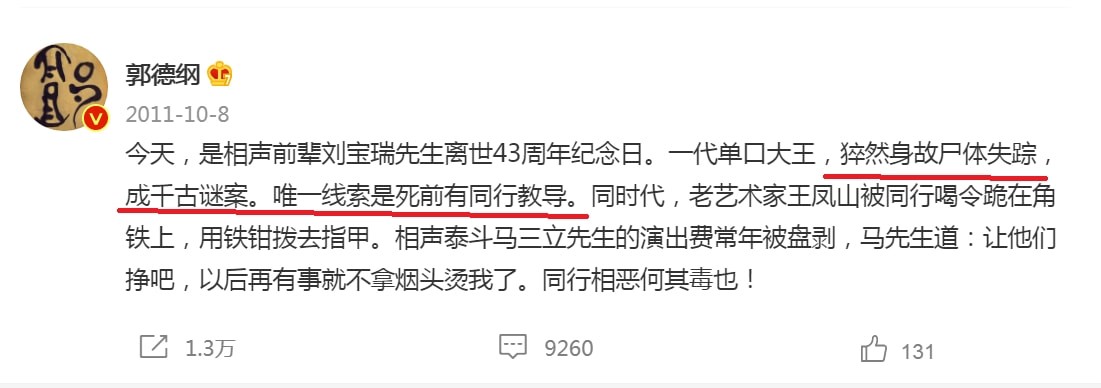 相声大师、单口相声泰斗刘宝瑞先生去世于1968年,半个多世纪后关于他的死因又被同行给翻了出来并且大做文章。