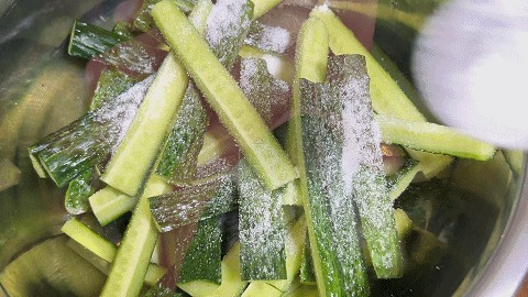 1、 黄瓜洗净切成黄瓜条,去掉瓜瓤,加入食盐抓匀腌制10分钟