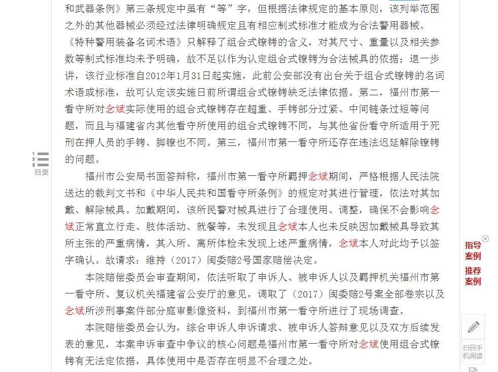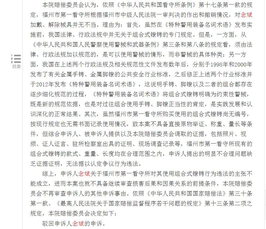 福建省高级人民法院赔偿委员会作出(2017)闽委赔2号国家赔偿决定,驳回了念斌的赔偿请求,认为福州市第一看守所对念斌使用组合式镣铐有法定依据,具体使用中不存在明显不合理之处。