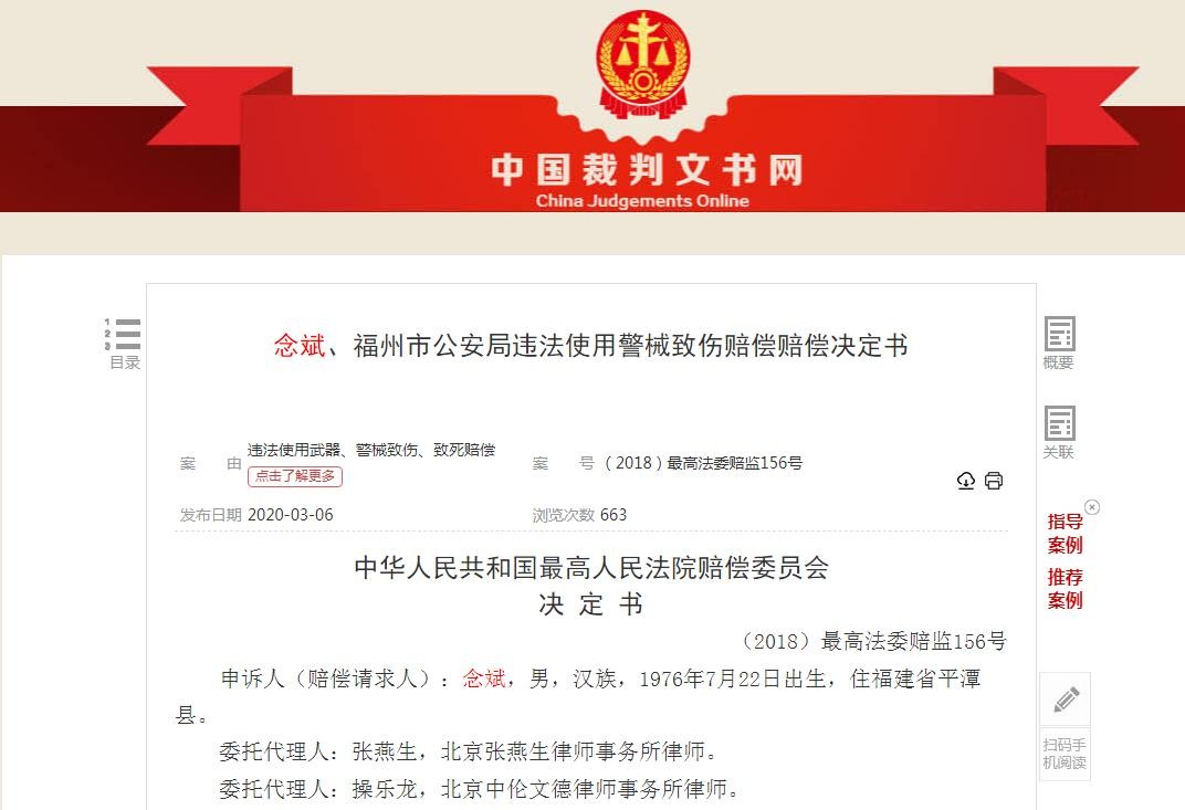念斌再次向福建省高级人民法院赔偿委员会申请国家赔偿,理由是福州市第一看守所违法使用警械致其受伤。