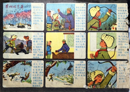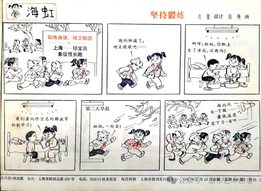 《红小兵》的封三有连载漫画《海虹》,署名绘画为“陆绳”其实是化名,“陆绳”是南方口音“六人”的谐音,寓意六个人拧成一股绳,由张乐平、詹同、周松生、李柏岗、毛用坤、杜建国等六位分别由画家、业余作者、编辑“三合一”组成,团队一起构思、共同创作,有这样的创作热情与干劲,小刊物自然办的很精致,上档次,在同类儿童读物中是数一数二的。