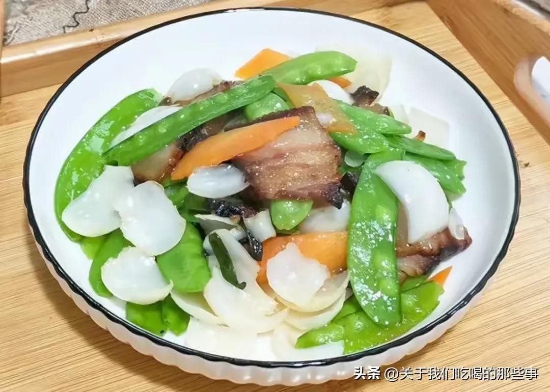 酱油肉的吃法,那也是多种多样。想吃原味的,就把它洗净,扔锅里蒸一蒸,蒸熟切成片,白花花的肉片子,蘸点蒜泥醋汁,往嘴里一塞,酱香瞬间在舌尖爆开,那感觉,美极了。还可以炒着吃,就说这道“酱油肉炒百合荷兰豆”,颜值高,味道更赞。