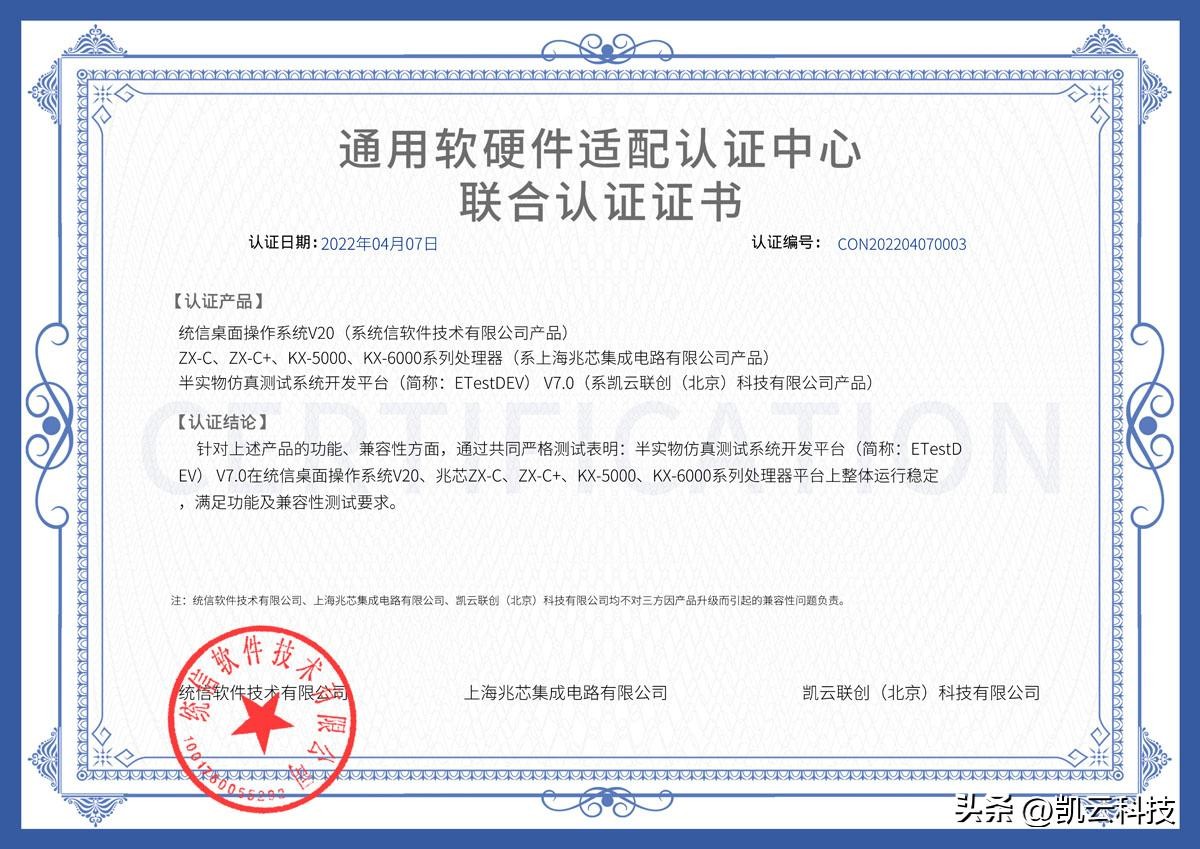 今年四月份,ETest通过统信软件联合认证,测试结果显示双方产品性能优异,完美兼容。即:半实物仿真测试系统开发平台ETest在统信桌面操作系统V20、海光3000系列处理器平台上整体运行稳定,满足功能及兼容性测试要求;半实物仿真测试系统开发平台ETest在统信桌面操作系统V20、兆芯ZX-C、ZX-C+、KX-5000、KX-6000系列处理器平台上整体运行稳定,满足功能及兼容性测试要求。