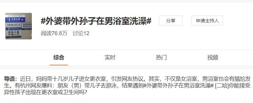 今天,关于#女子带儿子进游泳馆女更衣室# 、#杭州游泳馆规定超过3岁孩子禁止进异性更衣室、#外婆带外孙子在男浴室洗澡#、#女更衣室#、#游泳馆更衣室每天都有女性带儿子进来# 的话题,一天内微博热搜里出现了好几个。带孩子的家长往往认为“孩子还小”,而同处一室的其他人则感到不适尴尬。