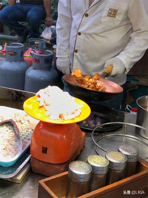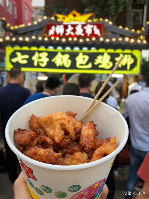 本来安排了拔草顺序,然而计划赶不上变化,我们见机行事,发现哪里人多就往那儿走,恰恰不远处一片热闹,原来他们在排队等待七仔锅包鸡柳,正是我俩任务列表的头号人物,亦是著名的“五绝”之一。
