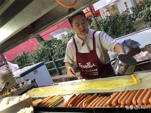 然后蛋液哗啦一下从一边浇到另一边,用煎铲涂抹均匀后每片翻个面,随即就是大把大把地投料,包括若干粉料、酱料、辅料,还有顾客可选的不同香肠。