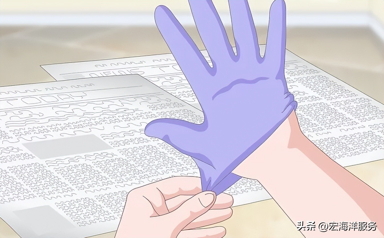 3、保护您的皮肤和工作区域免受染料的伤害。用报纸、防水布或垃圾袋盖住您的工作空间,这样即使有任何染料溅出,也不会弄脏您的桌子、柜台或地板。此外,附近有一些旧抹布或纸巾,您需要快速清理任何溢出物。然后,穿上旧衣服和厚手套,以免弄脏衣服和皮肤。