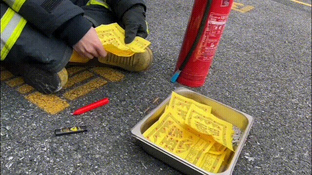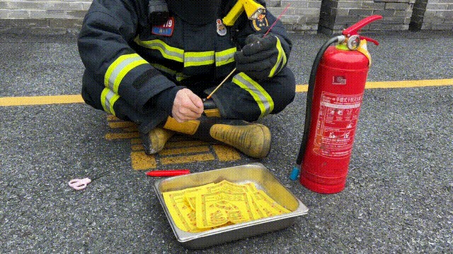 消防员点燃立香,当其充分燃烧后,将前端烧红香灰段剪下放在纸钱上,模拟风吹落香灰点燃附近可燃物。