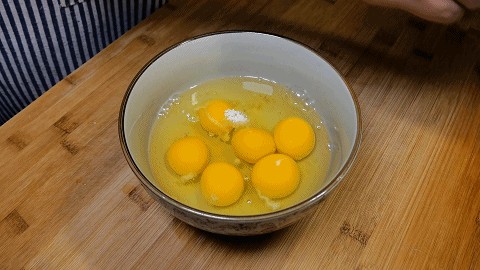 3.碗中打入五到六个鸡蛋,加入2克食盐、2克白糖、3克香醋搅拌均匀,加入香醋具有去腥增嫩的作用,鸡蛋的味道会有淡淡的酸味,要是不喜欢可以不放,再准备一把小葱切成葱段。