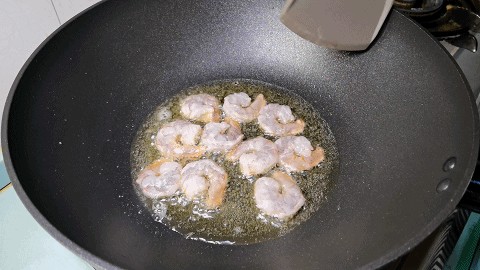 4.炒锅内淋入少许植物油,油热先下入虾仁煎1分钟,煎至虾仁两面变成红色后控油盛出。