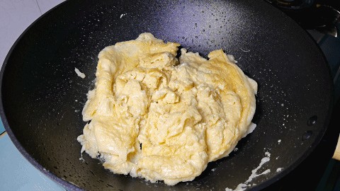 5.把锅内油温烧至六成热淋入鸡蛋液,鸡蛋刚下锅不要翻动,待鸡蛋定型后轻轻推散,炒成鸡蛋块。