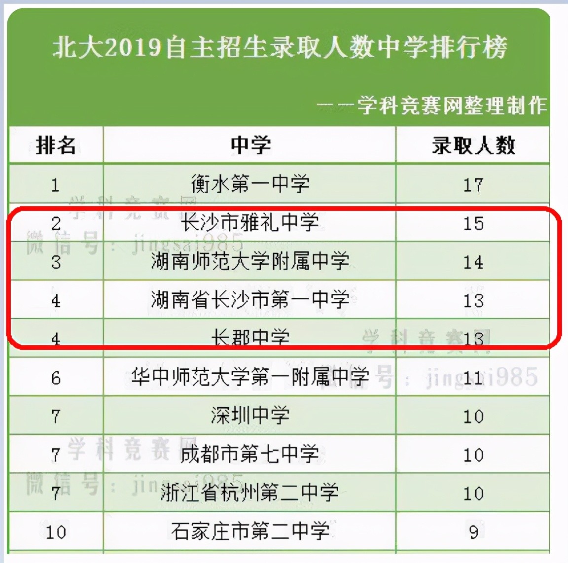 根据学科竞赛网整理的录取名单,2019年清华、北大自主招生中学排行榜中,长沙四大名校全部挺进全国前十名,在清华大学2019年自主招生中学排行榜中,长沙市雅礼中学排名全国第一,在北京大学2019年自主招生中学排行榜中,长沙市雅礼中学排名全国第二如图1,和图2所示。长沙的四大名校,既是湖南的四大名校也是全国的名校。