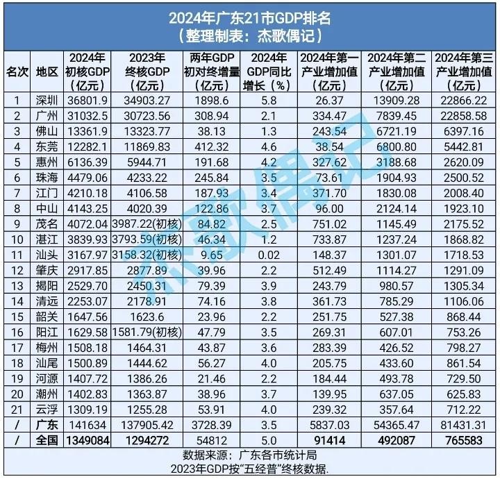 2024年广东21市GDP排名公布,潮州第20、揭阳第13、汕头第11