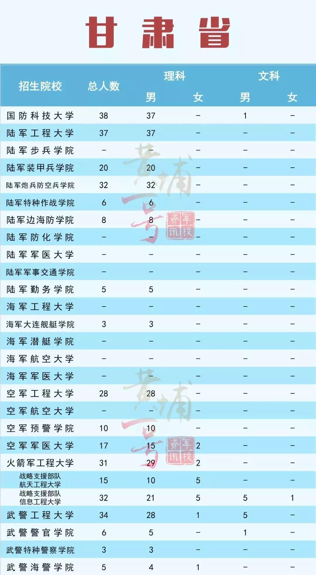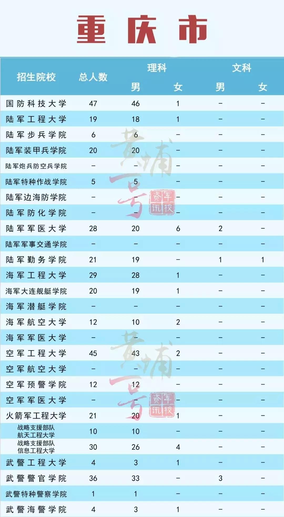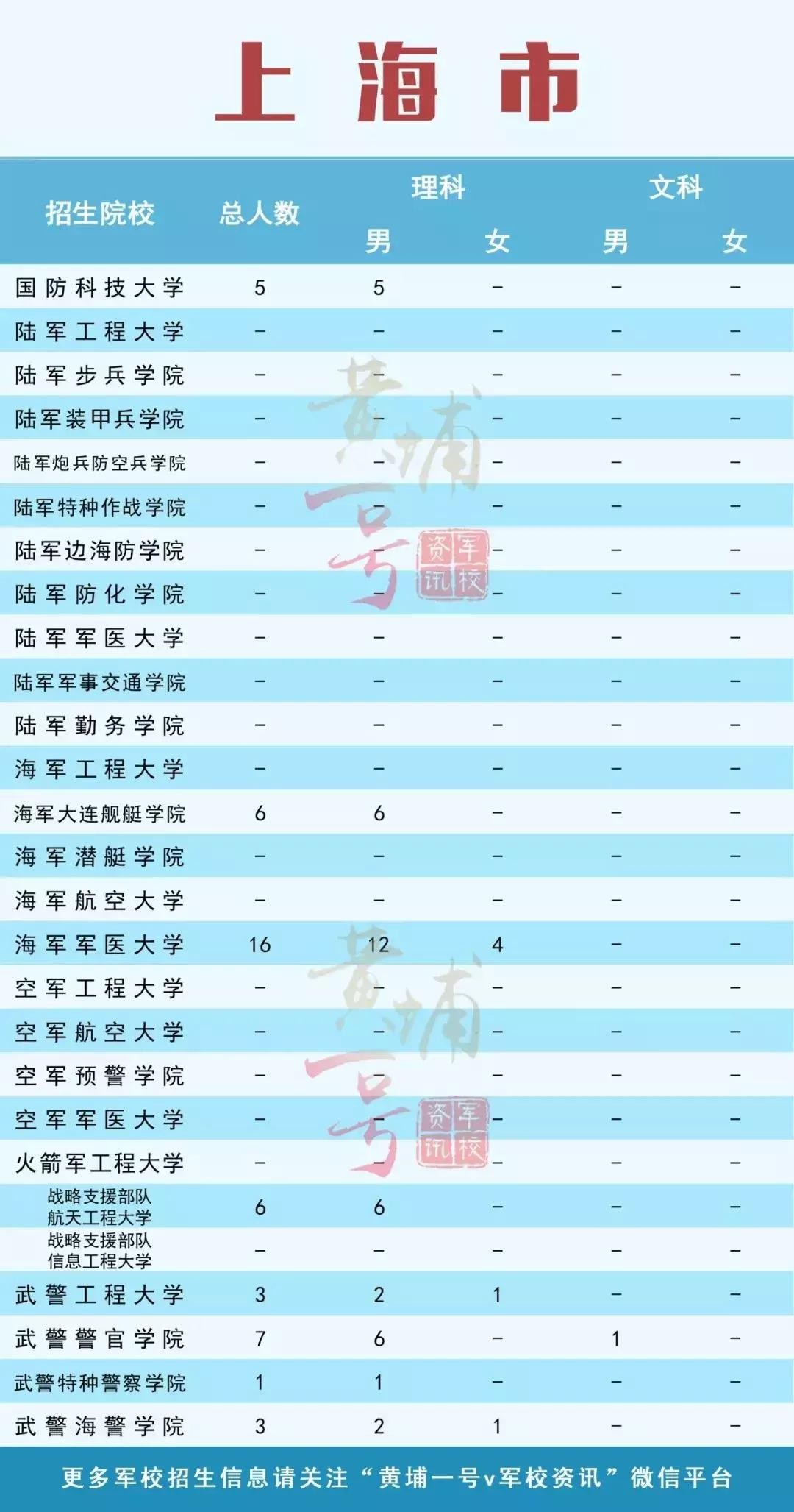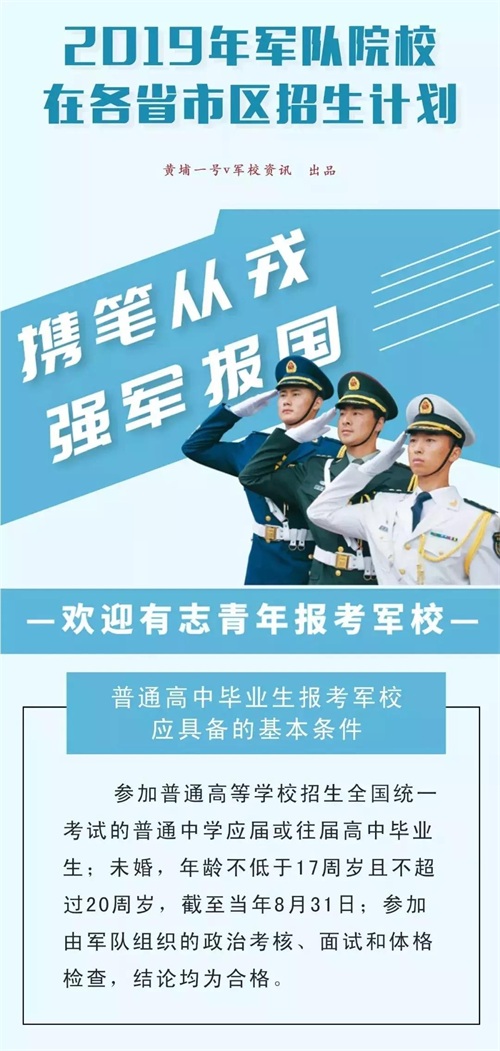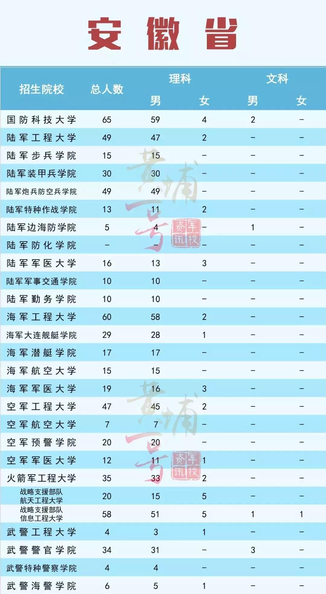温馨提示:以上军队院校在各省市区的招生计划,为各校在当地招生总数,没有具体到各专业的招生人数。考生报考时,须注意各校发布的专业目录,以及各招生专业的体检要求。