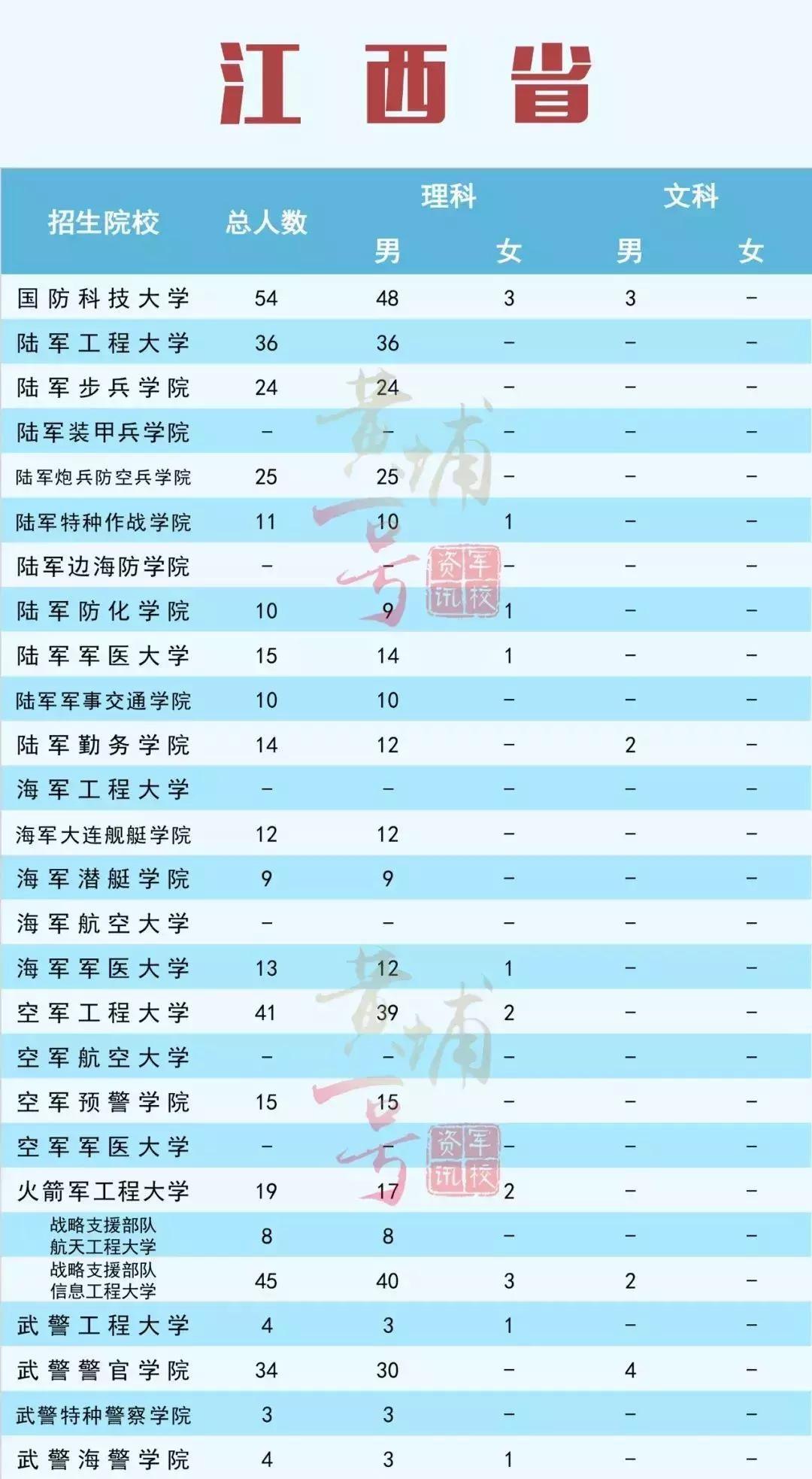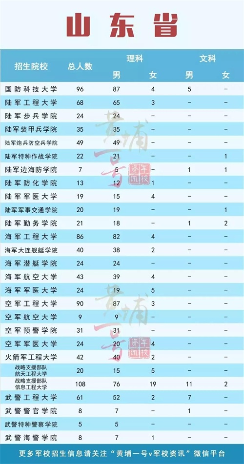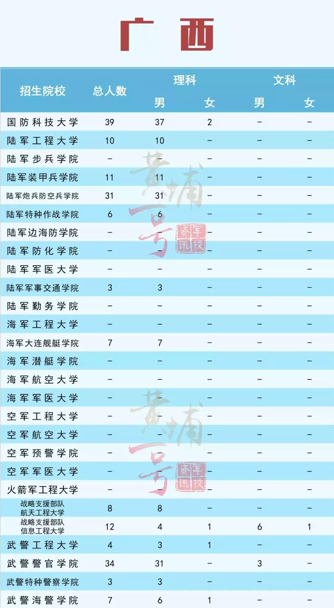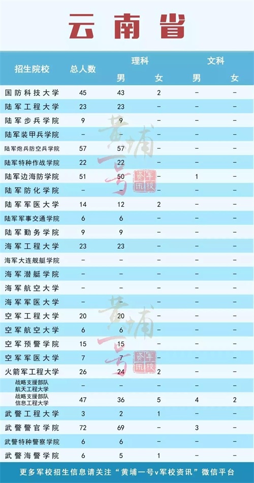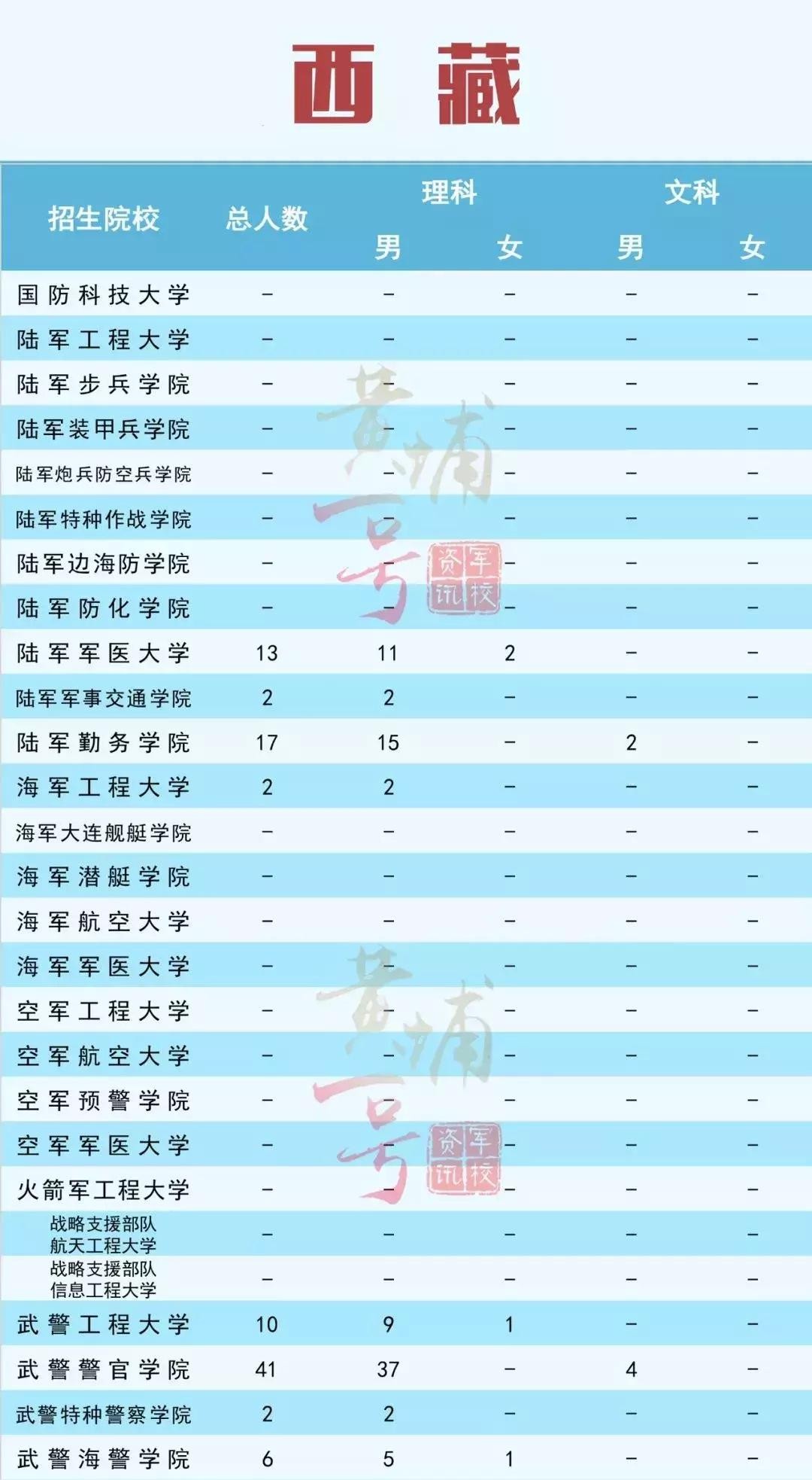温馨提示:以上军队院校在各省市区的招生计划,为各校在当地招生总数,没有具体到各专业的招生人数。考生报考时,须注意各校发布的专业目录,以及各招生专业的体检要求。