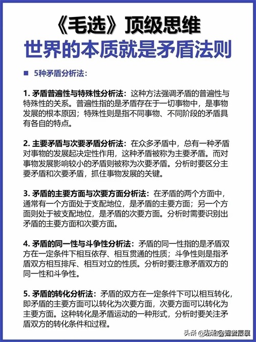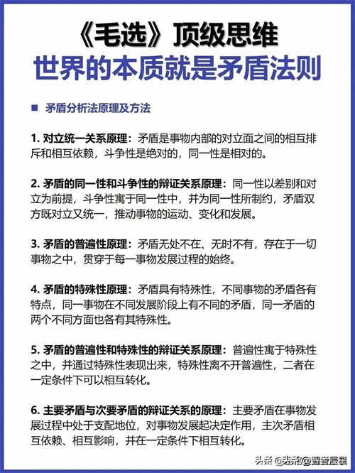 毛泽东凭借对矛盾法则的深刻洞察,领导中国革命披荆斩棘、改天换地;于今时今日,这一法则依旧熠熠生辉,照亮我们前行之路。它赋予我们穿透表象、直击本质的慧眼,面对生活琐碎、职场挑战、时代巨变,精准剖析矛盾、巧妙驾驭矛盾,以从容之姿书写精彩人生华章。此刻,就从细品身边矛盾现象、反思过往矛盾应对入手,将矛盾法则深植思维,向着驾驭人生、顺应时代全速启航。或许,下一次回首,你就能凭借这份智慧在矛盾漩涡中稳立潮头,收获他人赞叹目光,深知世界本质矛盾法则的磅礴伟力,坚定迈向辉煌未来之路。那么,就从现在开始吧!