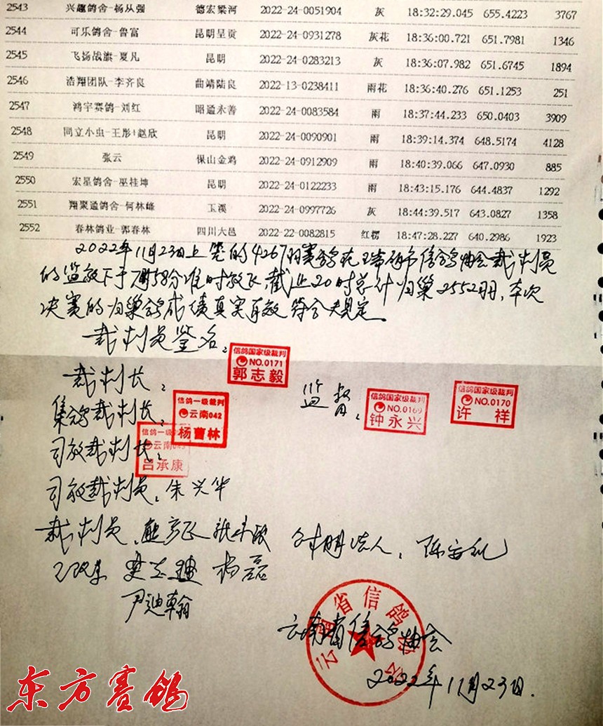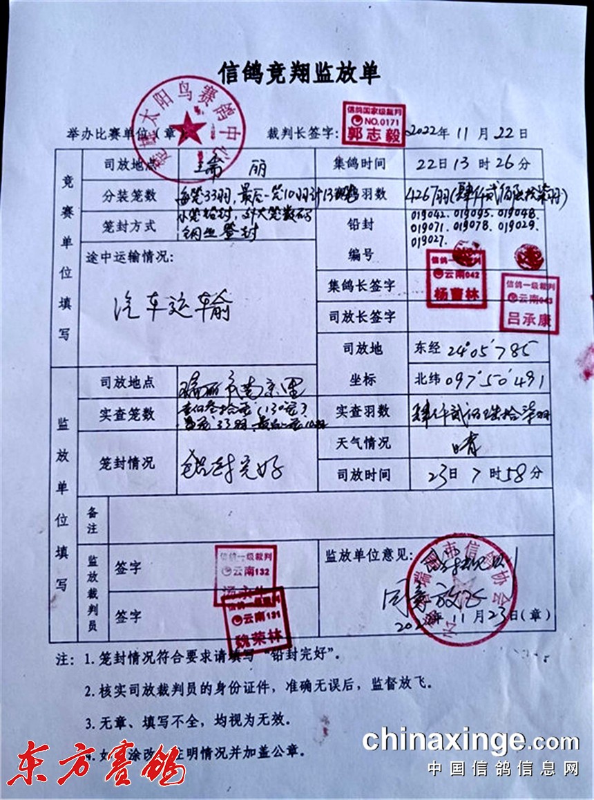 2022年11月22日下午1点,云南省信鸽协会许祥会长召集裁判员开会,明确执裁判员各自的职责,确保省监赛的太阳鸟公棚三公透明,本届执裁由云南省信鸽协会委派裁判执裁,共有裁判11人,其中国家级裁判3人、一级裁判3人、二级裁判5人。13点26分开始逐羽扫描、核对羽色、环号,加盖翅膀章、粘贴密码条、电脑同步录入上笼鸽信息,再装车上锁铅封。经过5个多小时裁判员们辛勤工作,共集鸽4267羽,上笼工作结束后,对鸽车上锁铅封,裁判员在集鸽单上签字确认;司放车由司放裁判长吕承康和司放裁判员朱兴华随车监赛。
