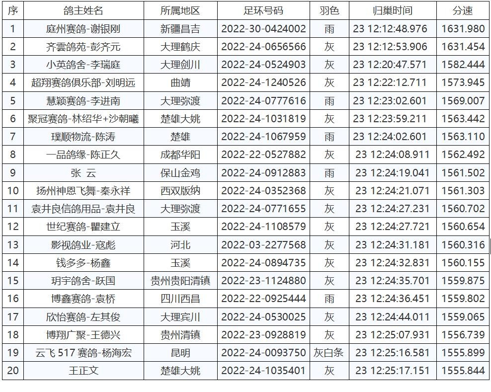 亚军:云南大理鹤庆齐雲鸽苑-彭齐元,环号2022-24-0656566灰于23日12:12:53.906分速为 1631.4537米/分,决赛上笼6羽,归巢四羽,其中二羽入赏2羽迟归,名次为2、877、1481,2337名。