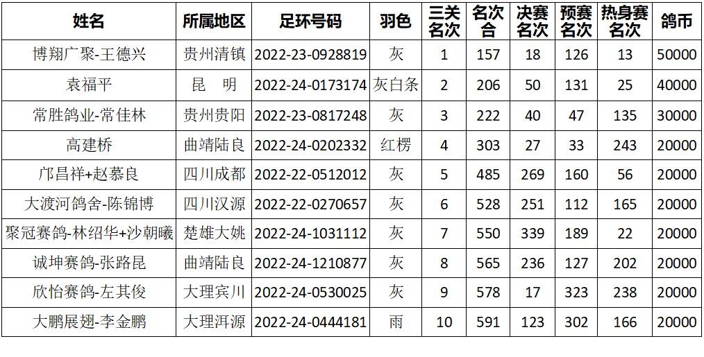 团体亚军 曲靖陆良诚坤赛鸽-张路昆、决赛上笼22羽,其中D组上笼7羽D组入赏4羽,68、81、649、716名入赏为团体亚军;同时A组回归4羽,236、297、619、958获得团体5名;亚军组团获前十名中两个团体奖,喜得20万大奖。总回归18羽,其中12羽入赏,名次为68、81、234,236、274、297、407、505、619、649、716、958名,6羽迟归。