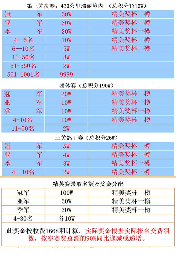 团体冠军 为广东鸽友张健所获,决赛上笼9羽,其中A组6羽B组3羽,A组5羽回归夺冠,名次分别是466、700、712、735、996名入赏。
