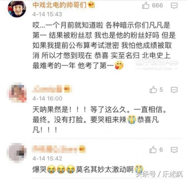 粉丝看到了之后表示“已经哭出来了”“实至名归”。据说今年比往年难考点但还是考了第一,说明他还是很有实力的嘛 ,是一个实力派选手