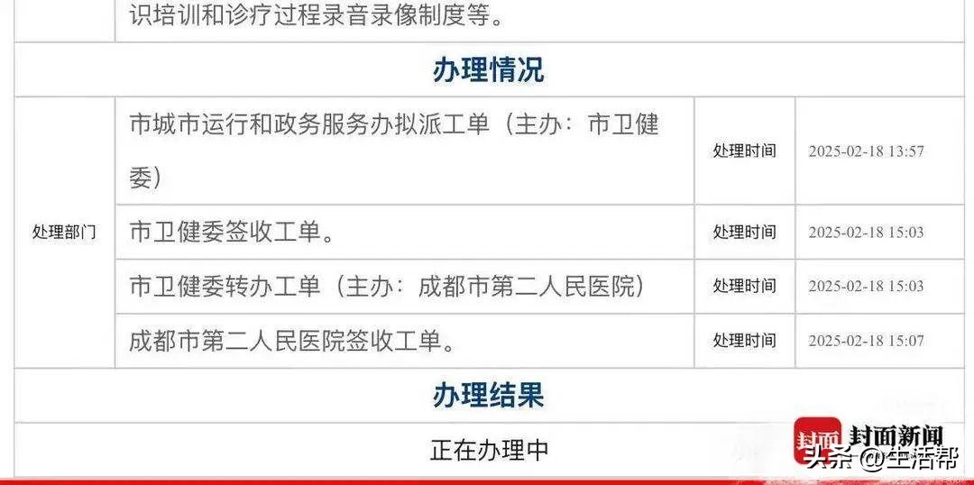 针对此事,记者致电成都市第二人民医院门诊咨询中心,工作人员表示医院已知晓这起事件,并指派了工作人员跟进处理。处理结果出来后会第一时间同步给患者。对于事件是否属实,以及投诉进展如何,该工作人员表示:“进展不清楚。”