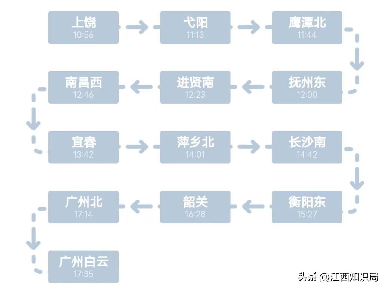 其中,列车在弋阳站停靠16分钟,抚州东站停靠10分钟,南昌西站停靠13分钟,进行待避。截止目前,上饶站至广州白云站每天只有1趟高铁,3趟普速列车。