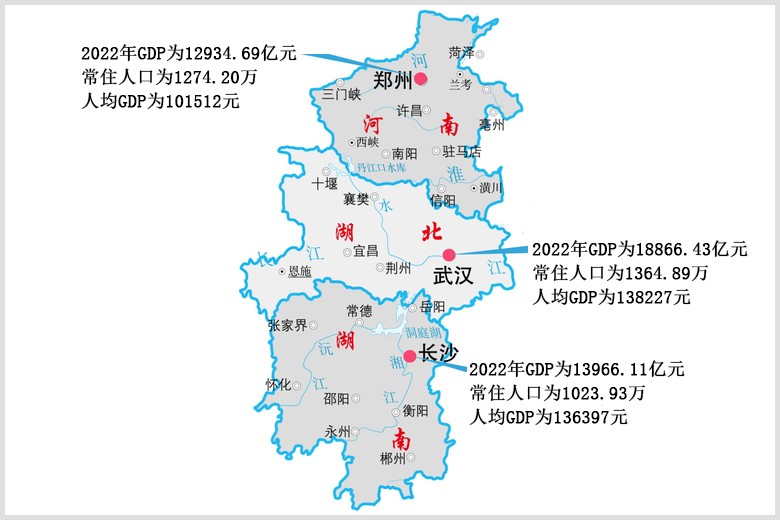 华中地区面积约56万平方公里,常住人口约2.23亿,2022年GDP总量为163750.34亿元。人均GDP为73316元。落后于全国平均水平的85708元。不过华中地区有一个独一无二的特点,所辖三个省都是经济大省。