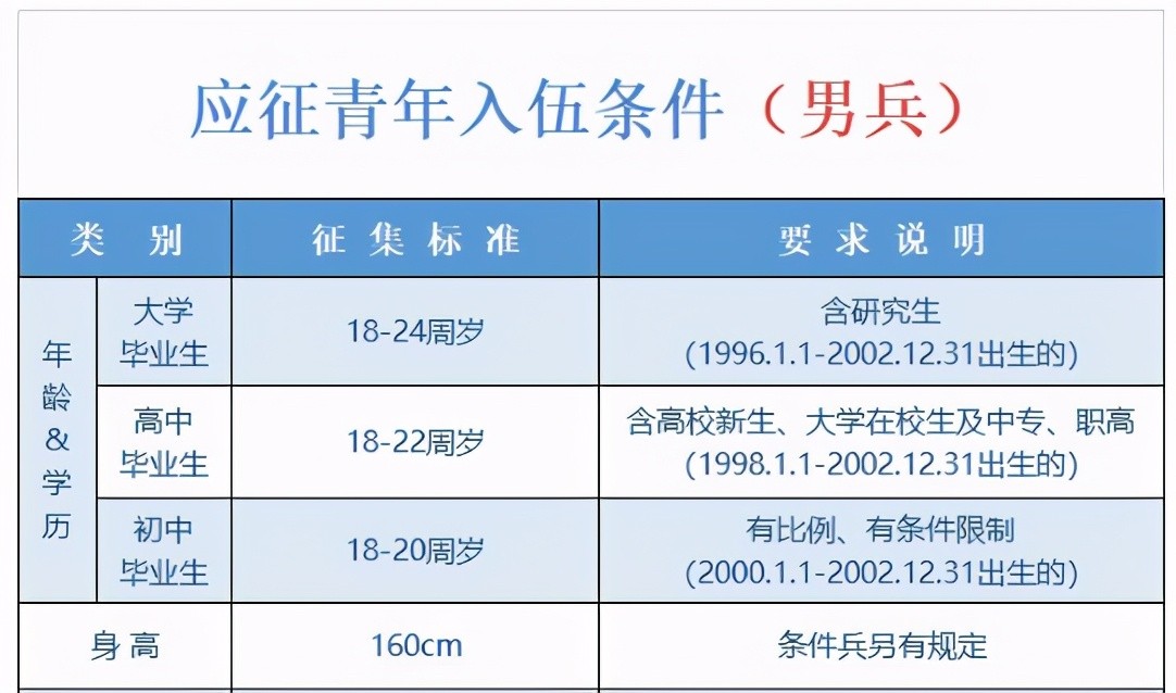 首先,小编可以给大家一个肯定的答复:只要你满足入伍的规定年龄,就可以再次入伍到军营服役。而我们都知道对不同层次学历的青年,入伍年龄限制都有所不同,相面以2020年男兵招收对象为例: